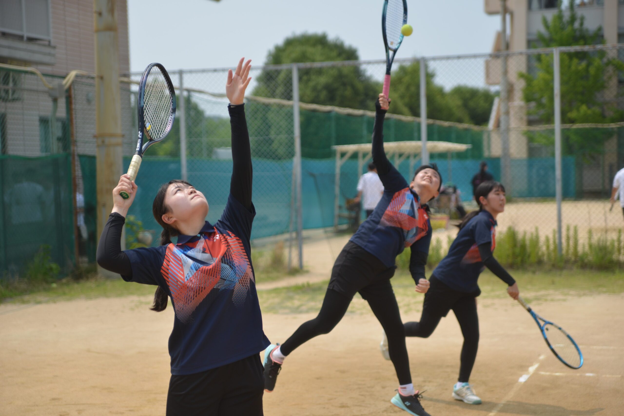 硬式テニス部(女) 2年生3人,1年生3人で放課後(火、水、木、金+土)練習しています。中学校時代硬式テニスやソフトテニスの経験者もいますが、大半は初心者で(中学では音楽関係のクラブに入っていたり、別の運動部だった人もいます。)、みんな一生懸命練習しています。年間を通じていろいろな大会に参加して、良い成績を上げようと頑張っています。