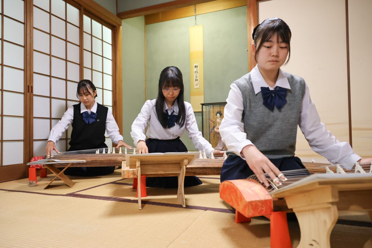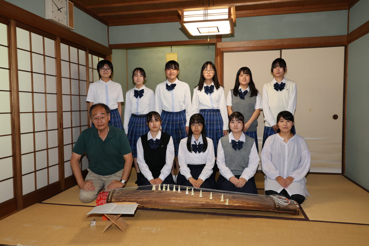 筝曲部 近隣では少なくなってしまった筝曲部ですが、和泉高校では毎年数名の生徒が活動しています。 普段は週に2回練習日を設け、師範の先生をお招きしてお稽古をしていただいています。最近は古典的な曲に加え、ポップスを編曲した楽曲にもチャレンジしています。 全員が初心者として入部していますが、3年生にもなると難しい曲も弾きこなせるようになってきます。箏の美しい音色が響き、日本の雅を感じることができます。