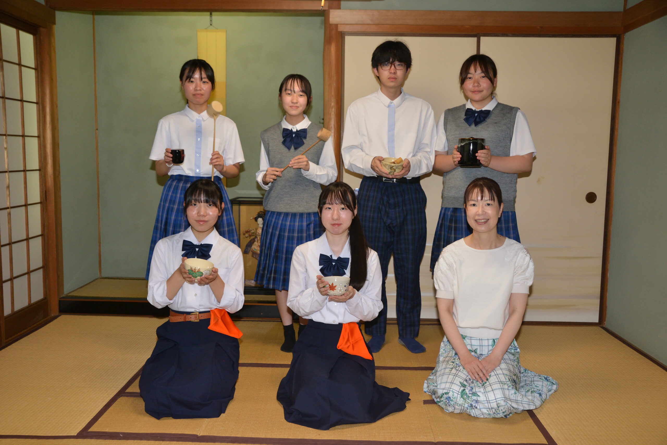 茶道部 私たち茶道部は、毎週水曜日と木曜日の放課後、二時間程度活動しています。木曜日は、外部から先生をお招きして教えていただいています。流派は表千家で、正しい作法が身に付き、二年の終わりには御免状も取得できます。御免状は、「表千家 入門・小習」です。また文化祭では、毎年、部員全員が浴衣を着て、練習成果発表のお茶会を開いています。茶道といっても硬い感じではなく、みんなが仲良く明るい雰囲気の中活動しています。